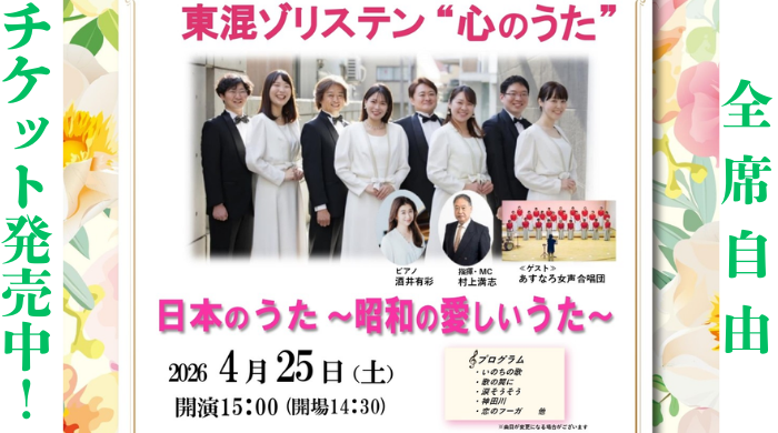 - 2026.01.24コンサート🎼【声楽アンサンブル】 2026/4/25(土)開催 東混ゾリステン ❝心のうた❞ 日本のうた~昭和の愛しいうた